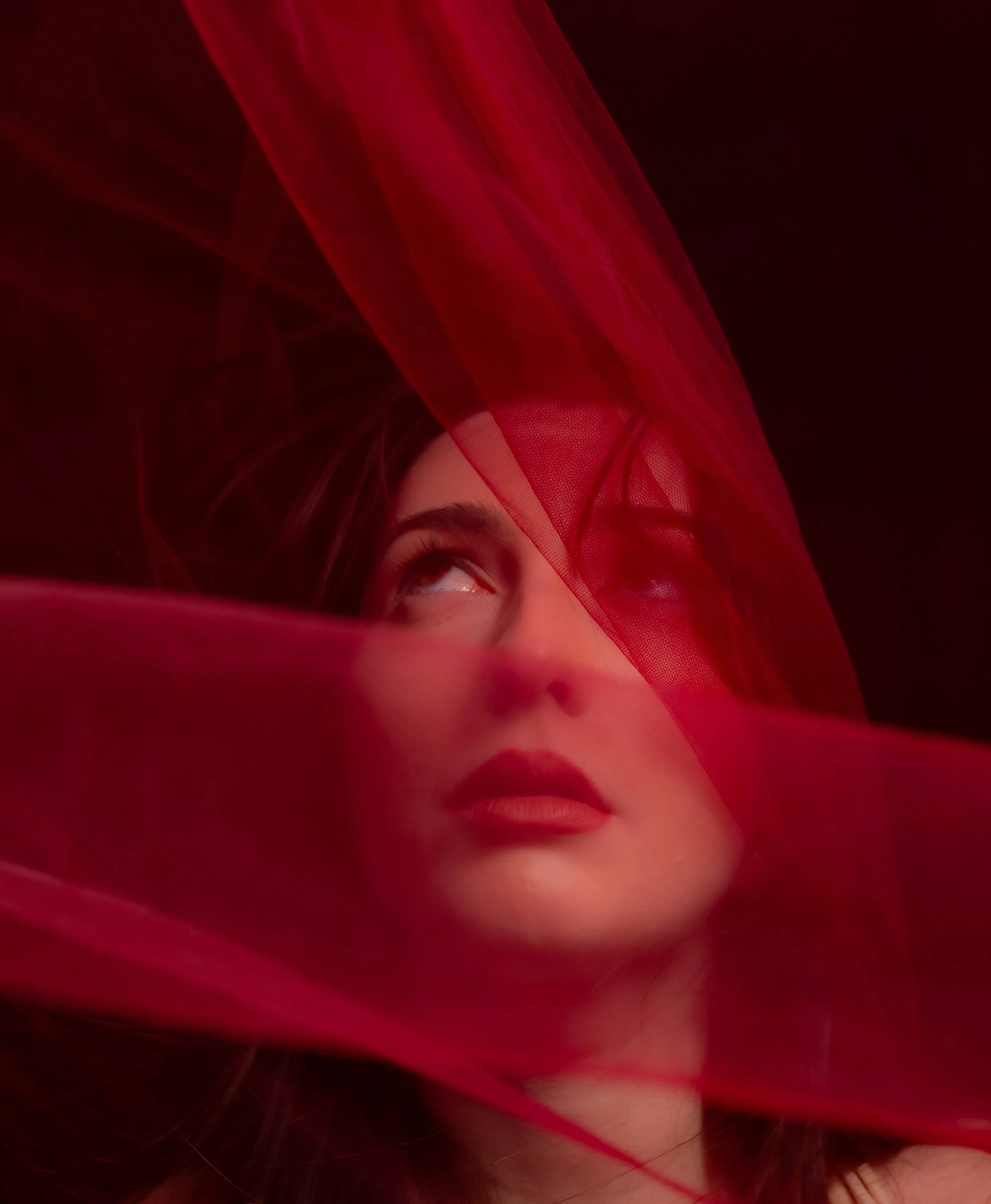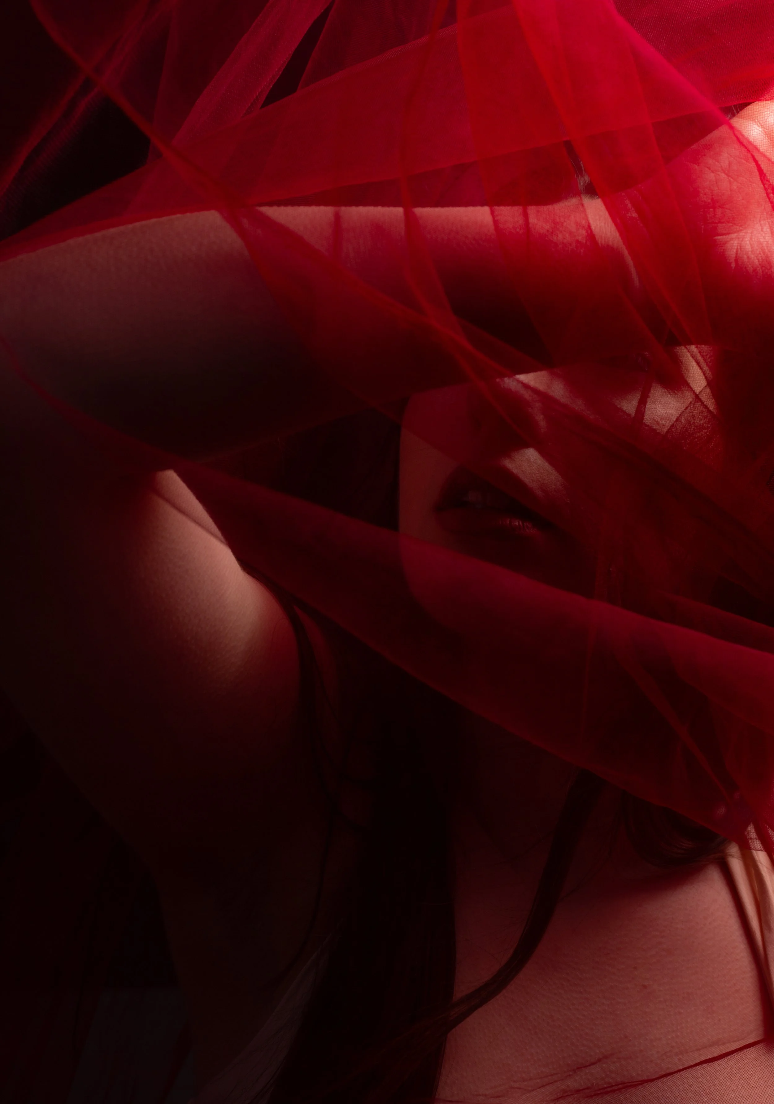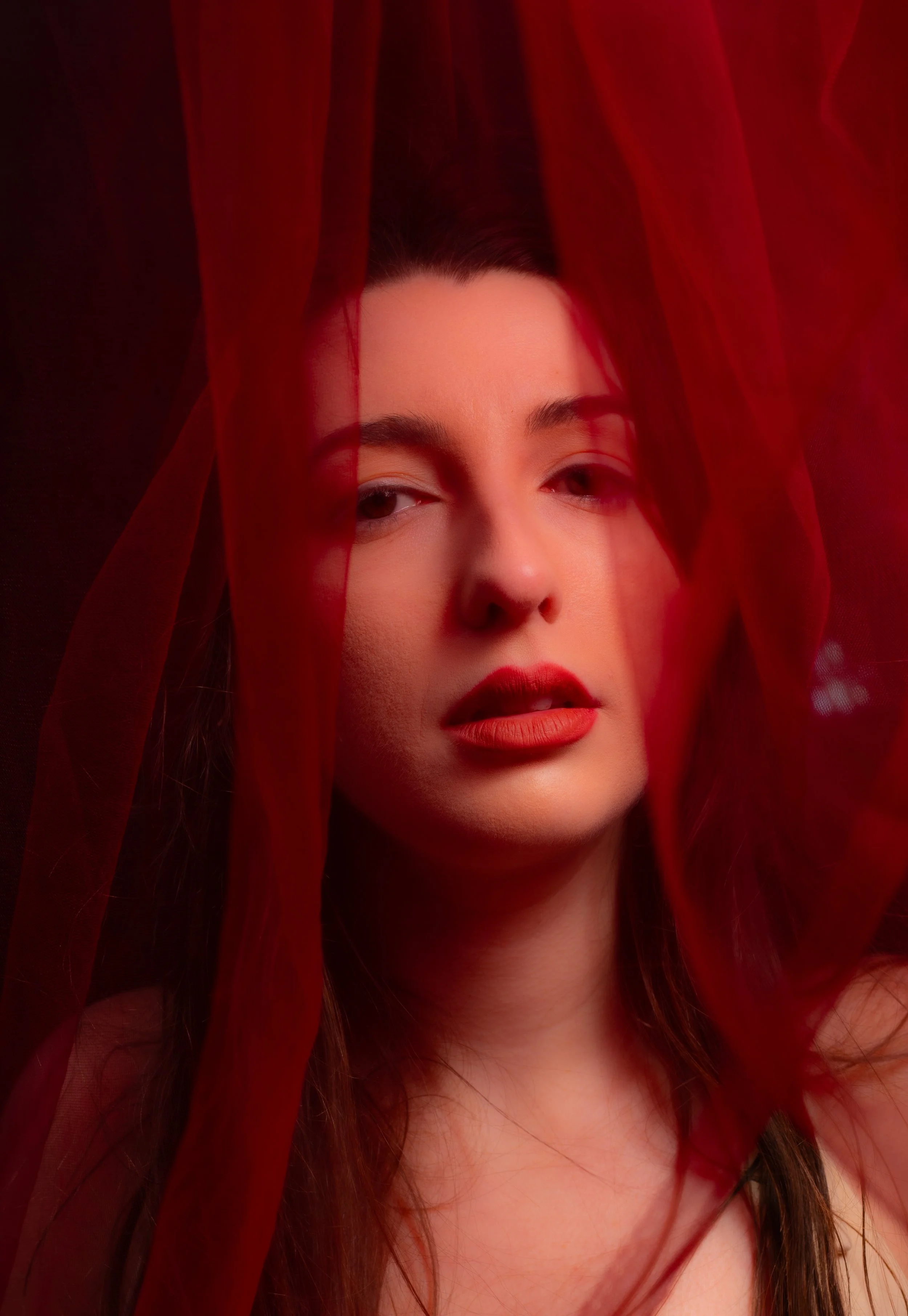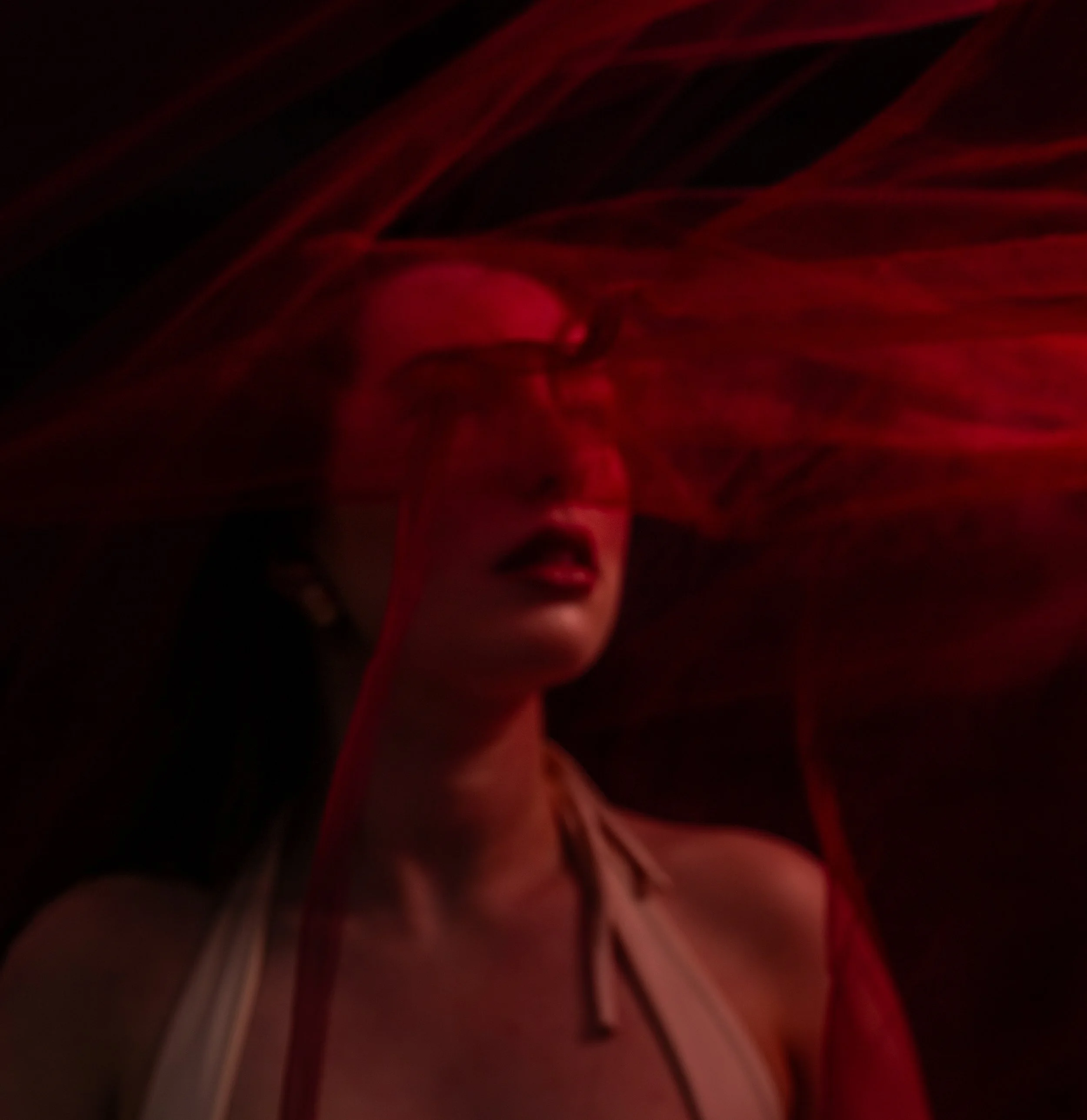 Woman with red hair sitting on a wooden stool, wearing white lingerie, with one hand on her head, in a low-light setting.
