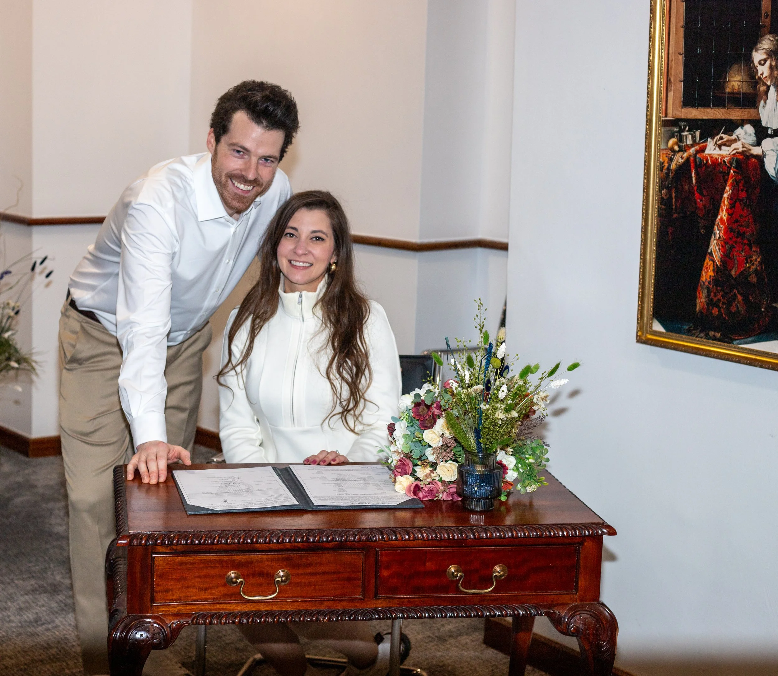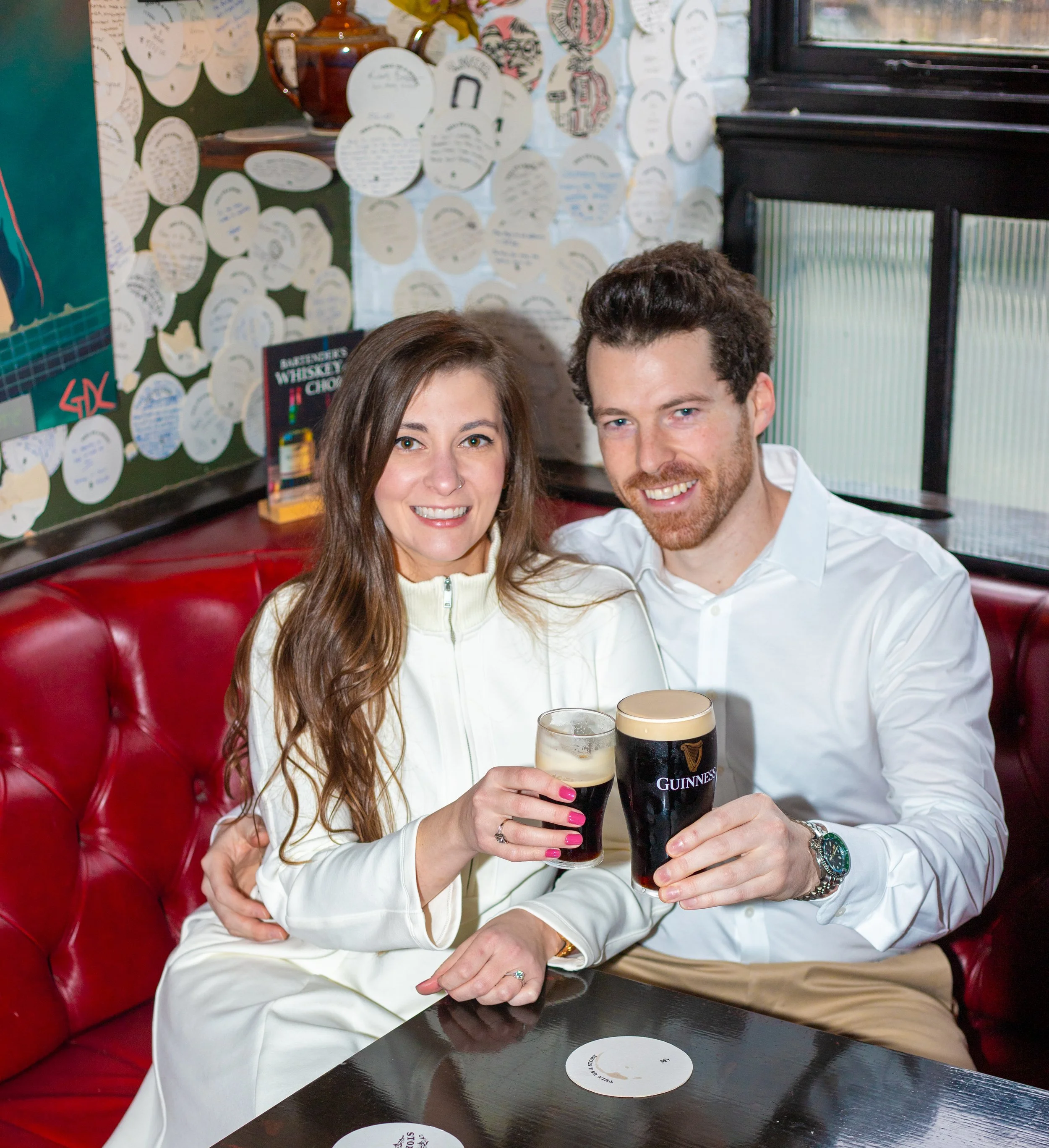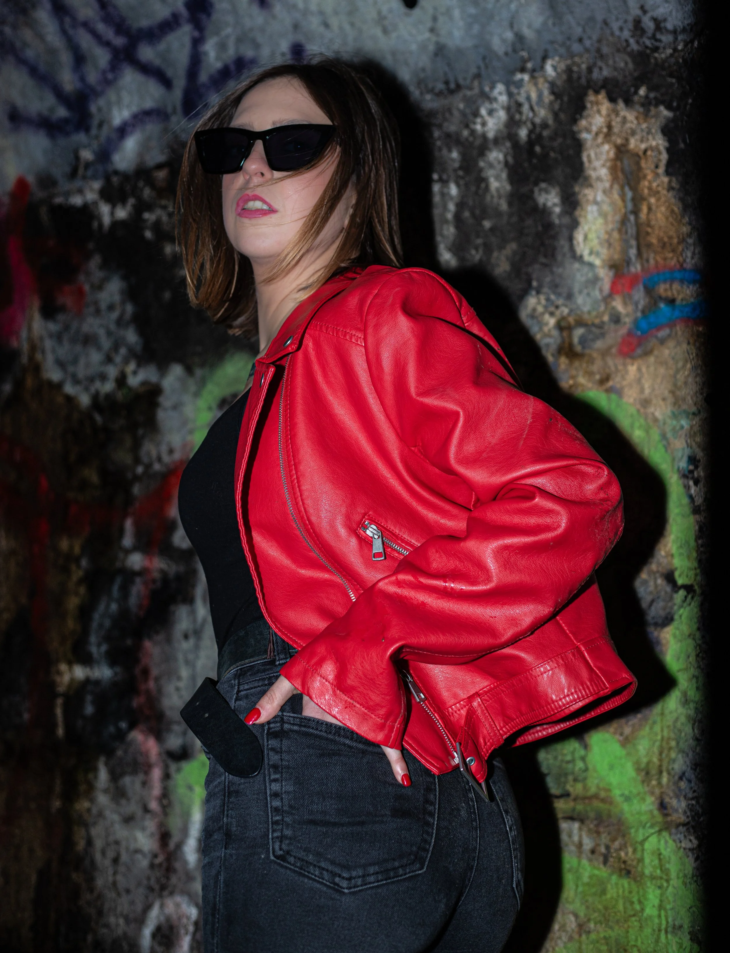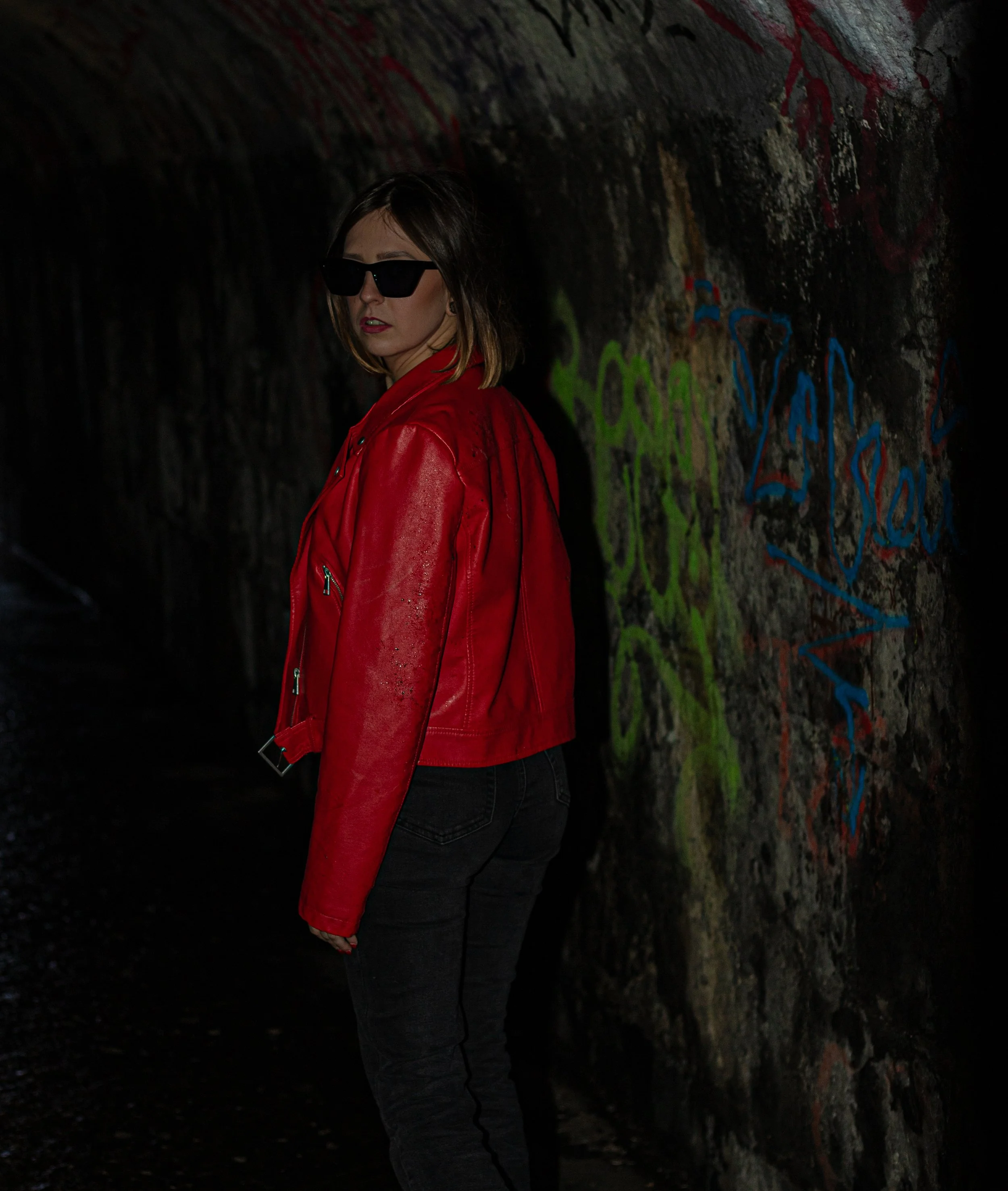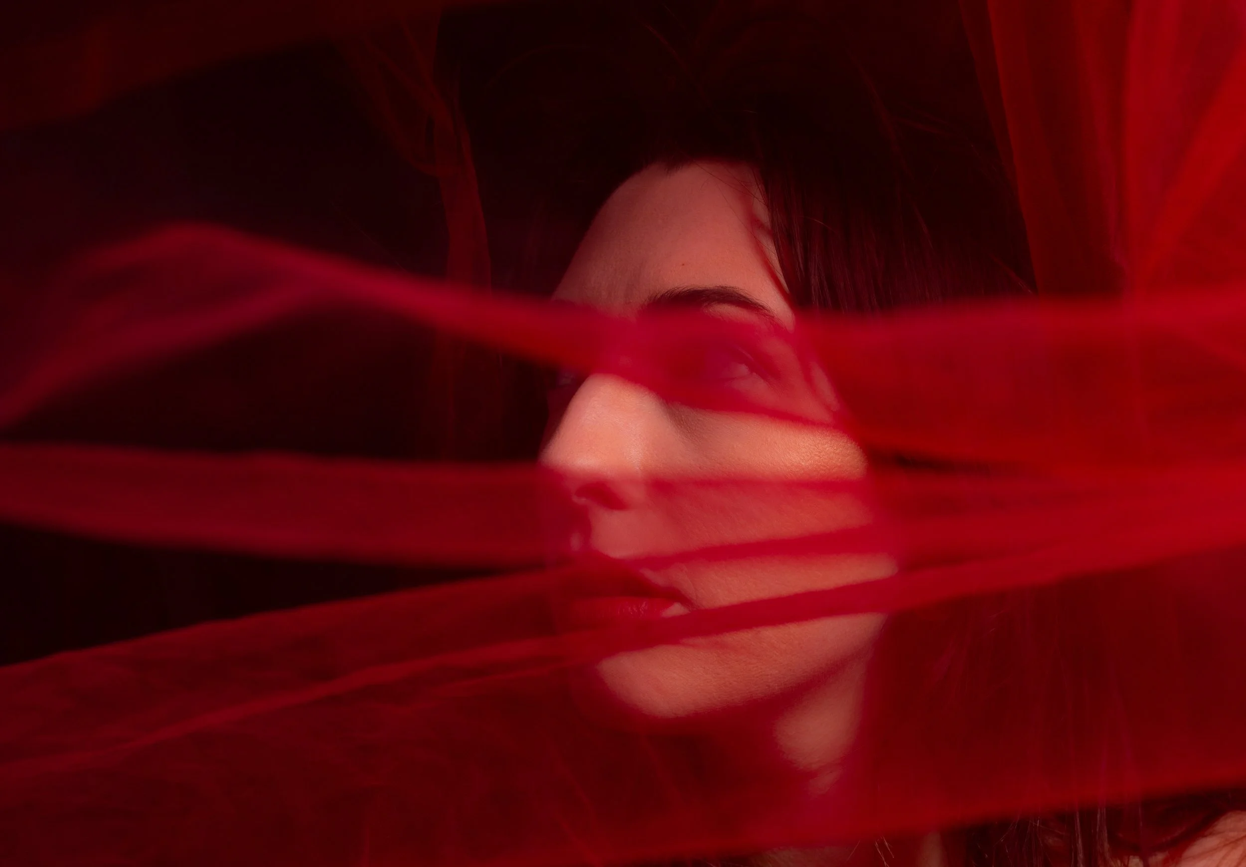 Woman with red hair sitting on a wooden stool, wearing white lingerie, with one hand on her head, in a low-light setting.