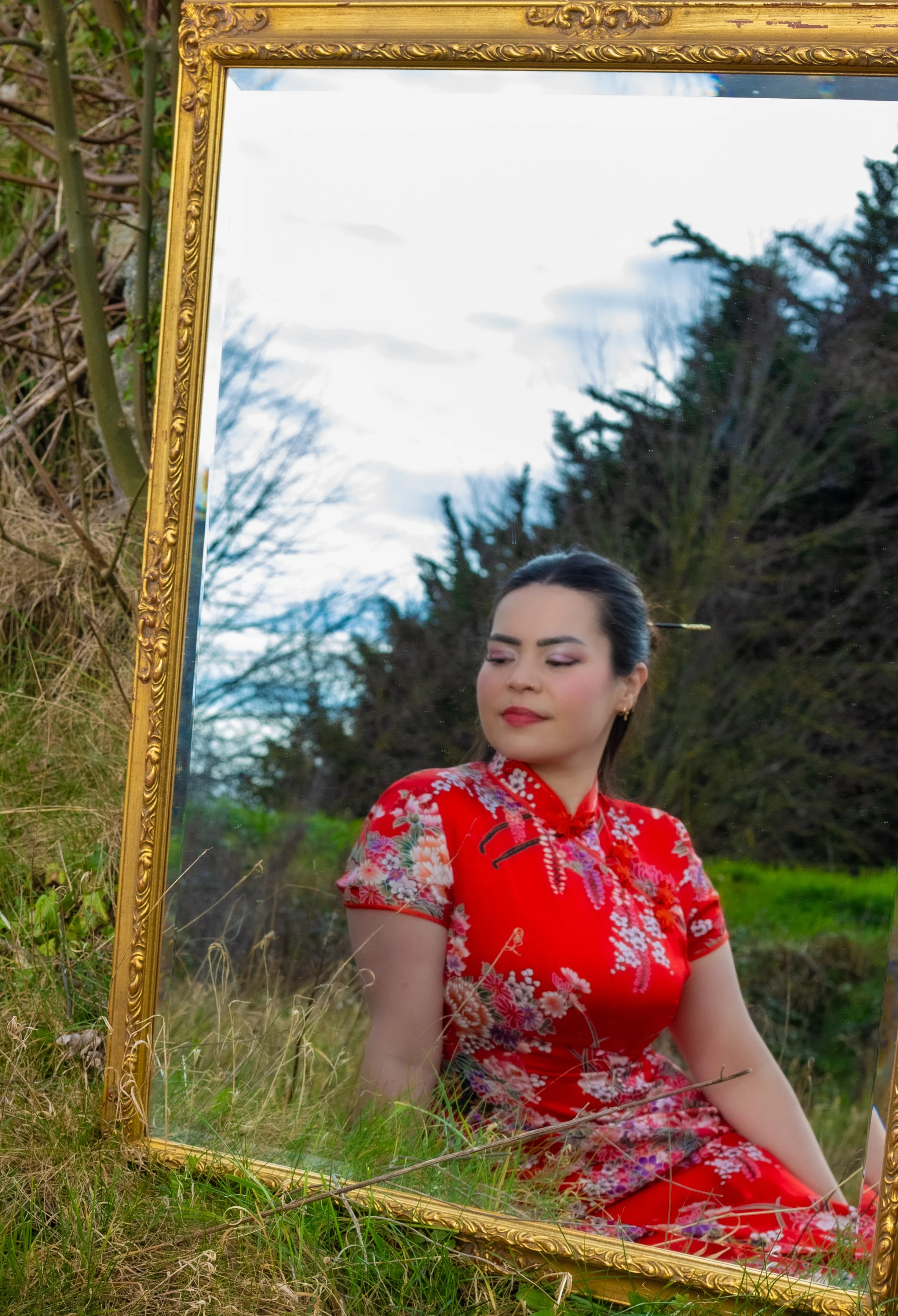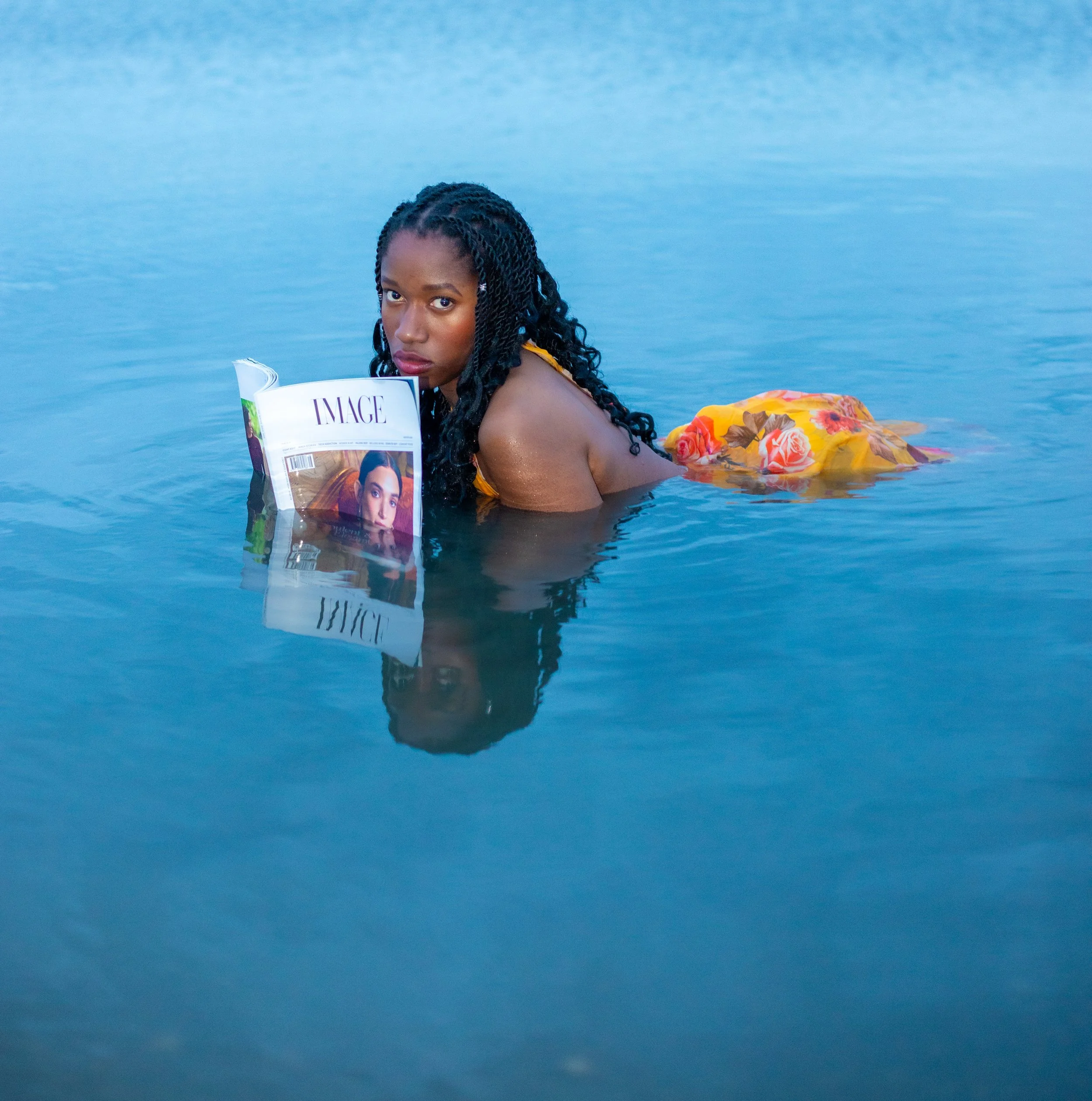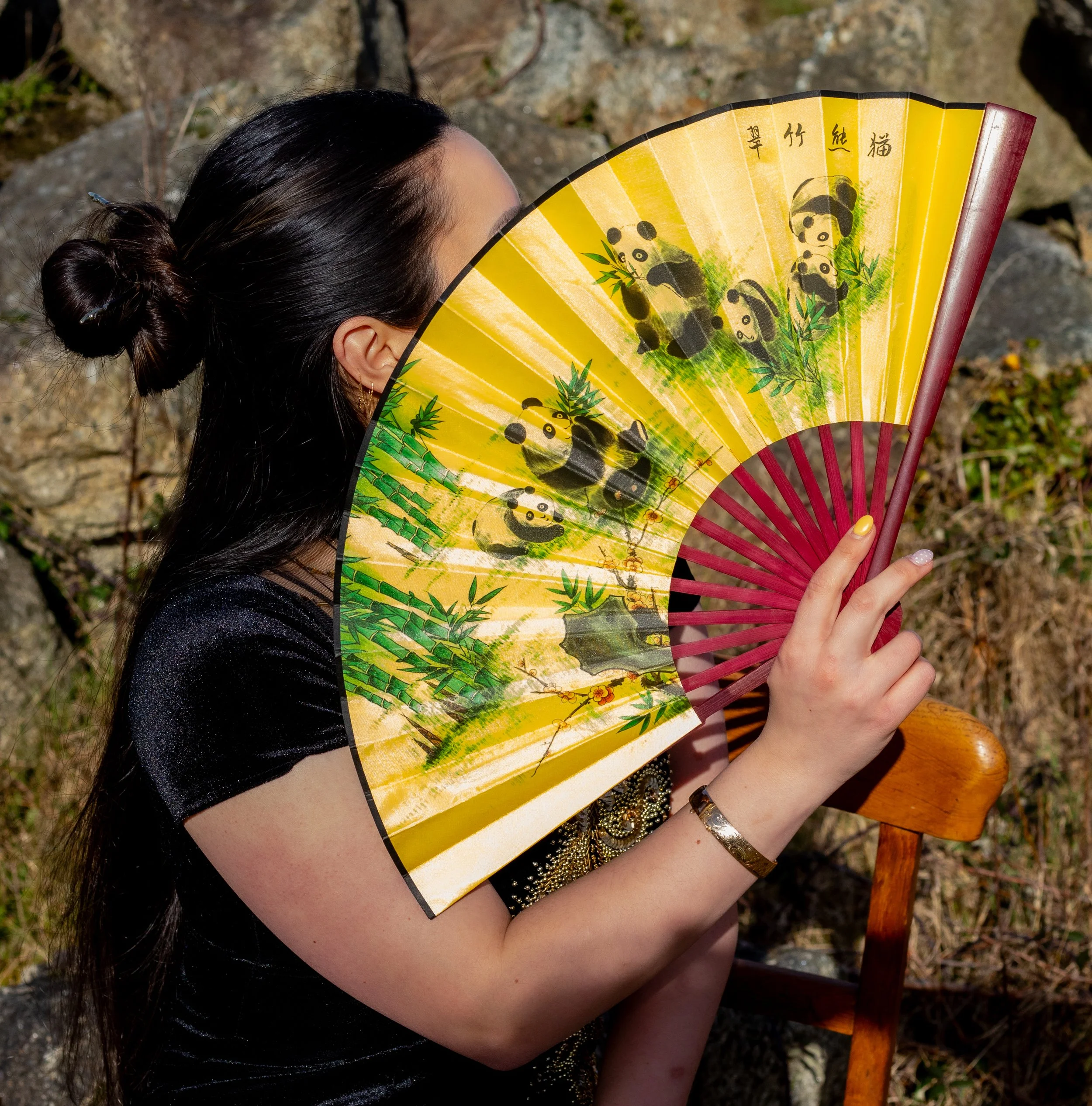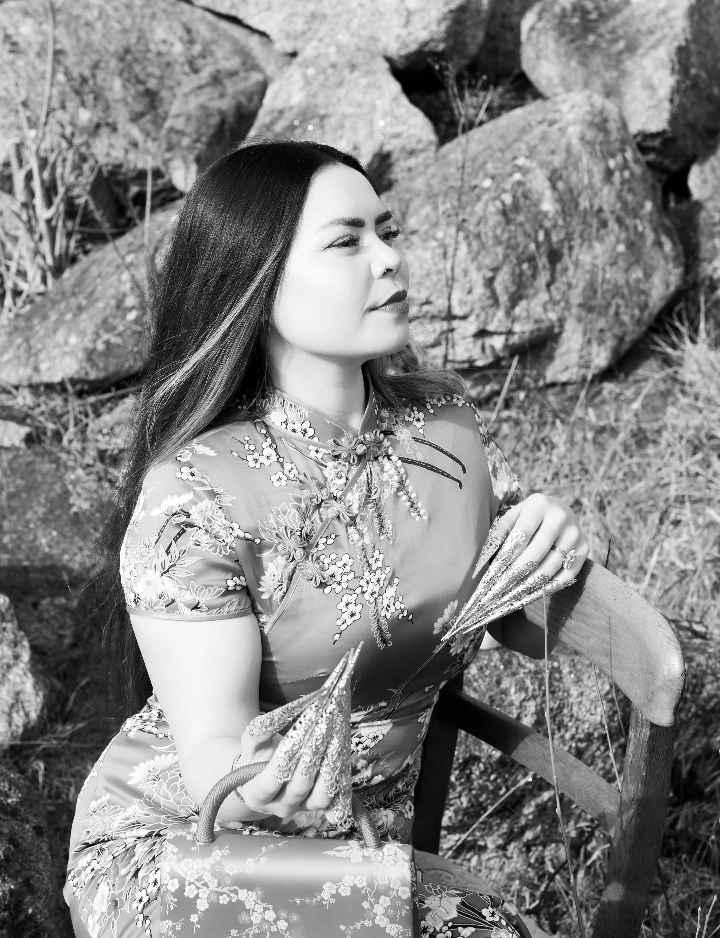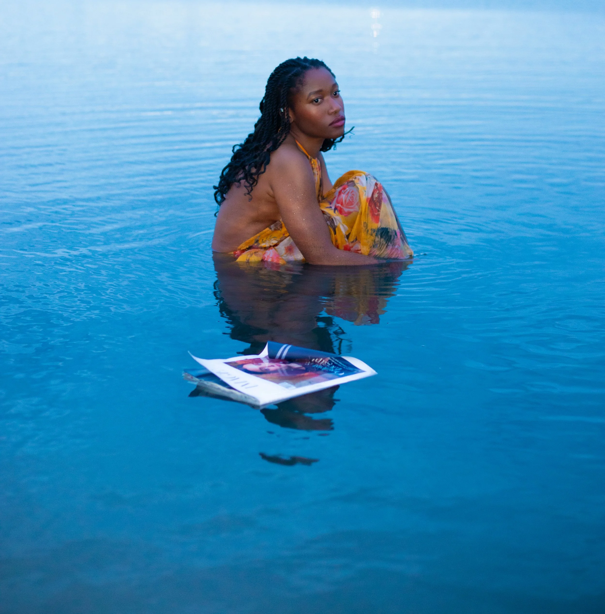 A woman with long black hair wearing yellow lingerie sitting outdoors during sunset, surrounded by greenery and flowers.