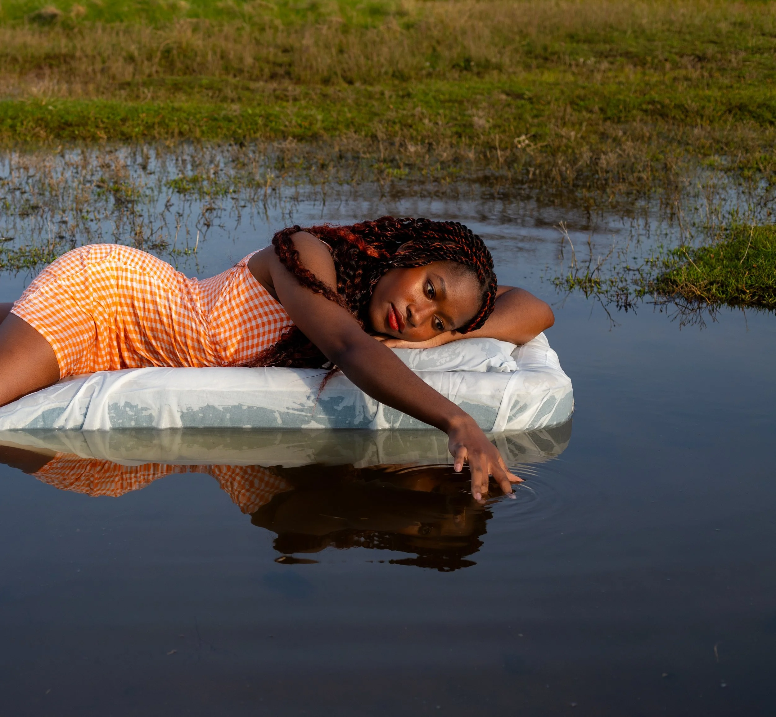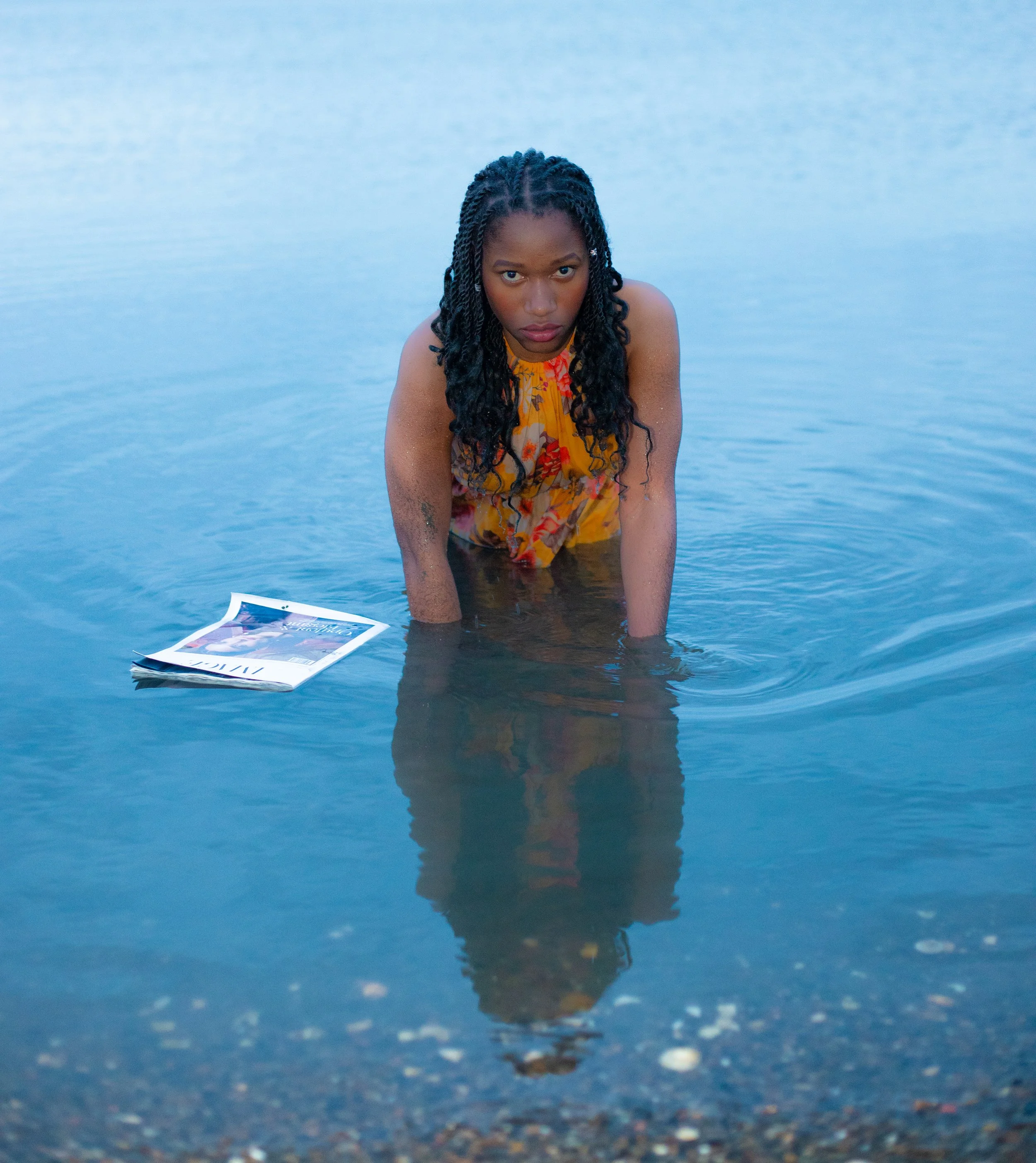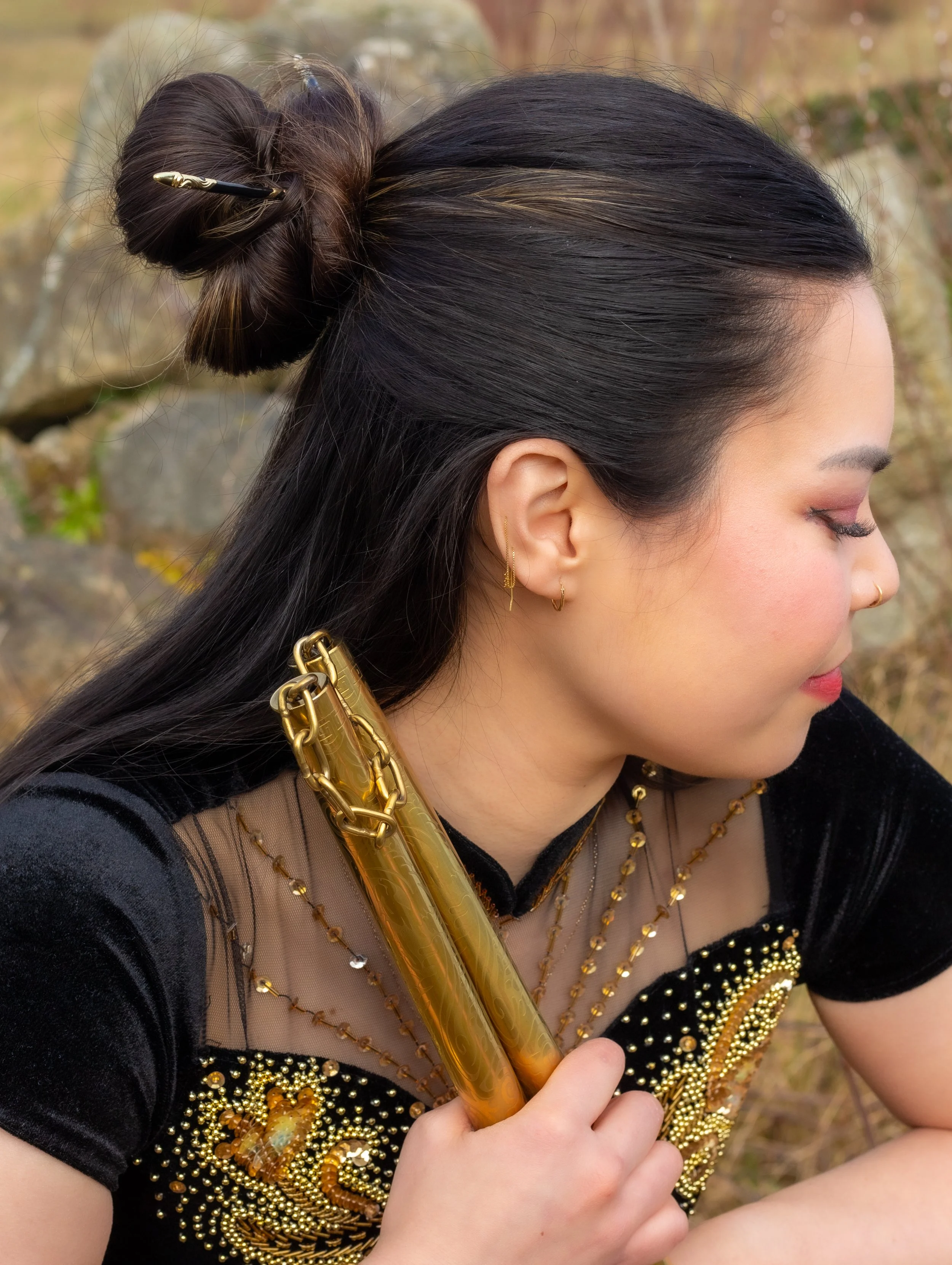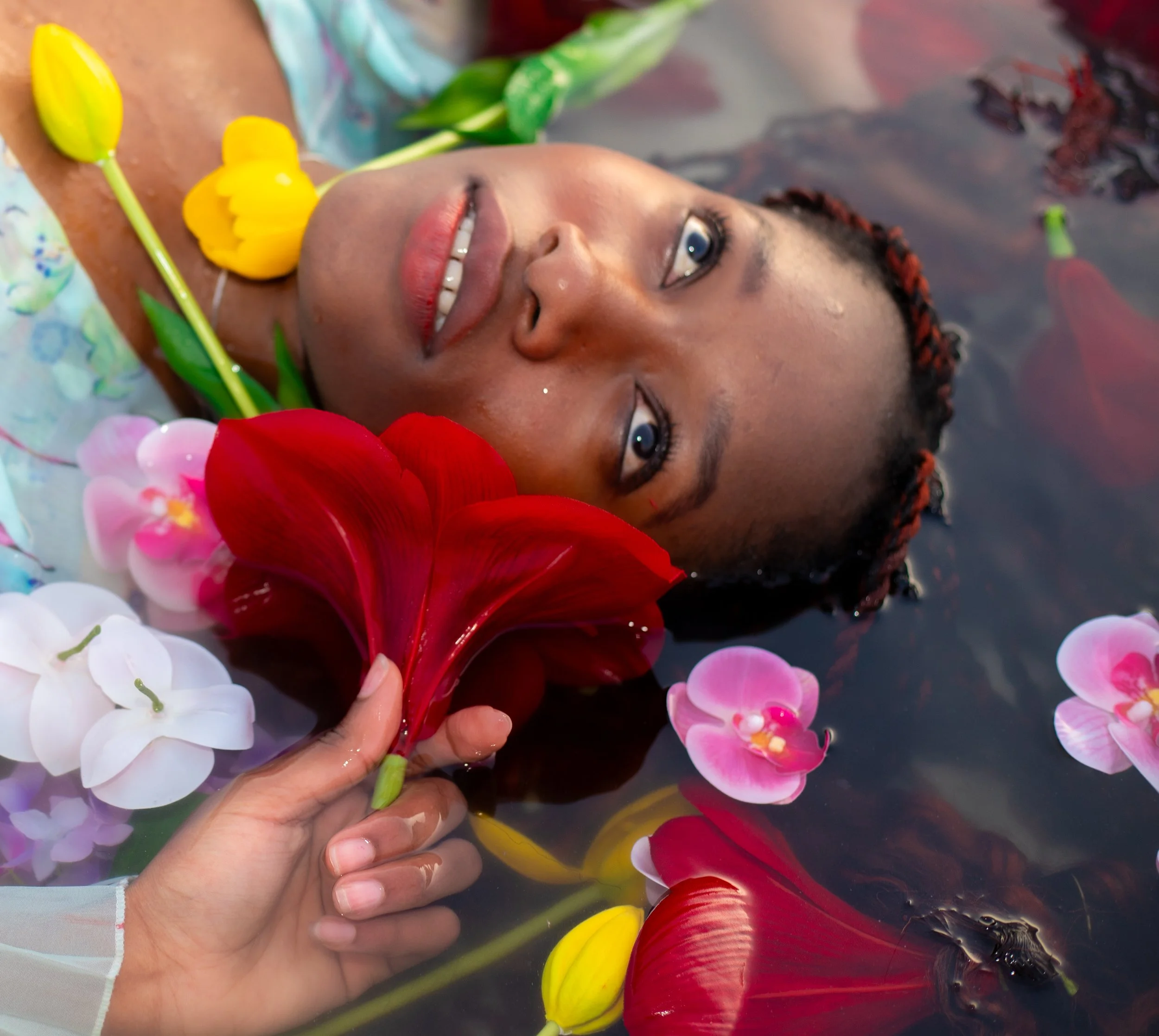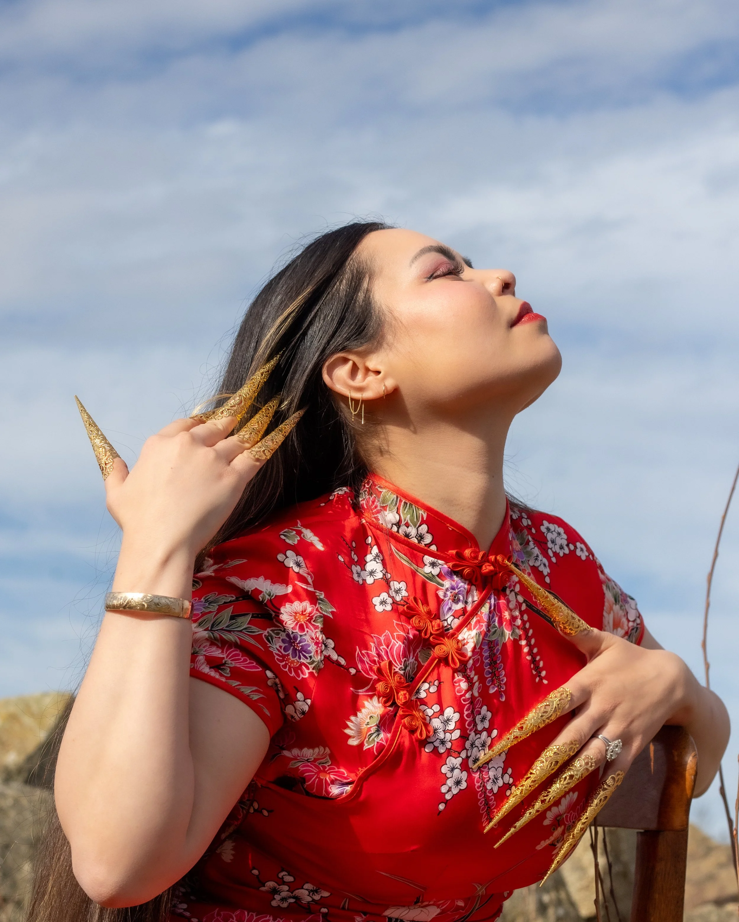 A woman with long black hair wearing yellow lingerie sitting outdoors during sunset, surrounded by greenery and flowers.