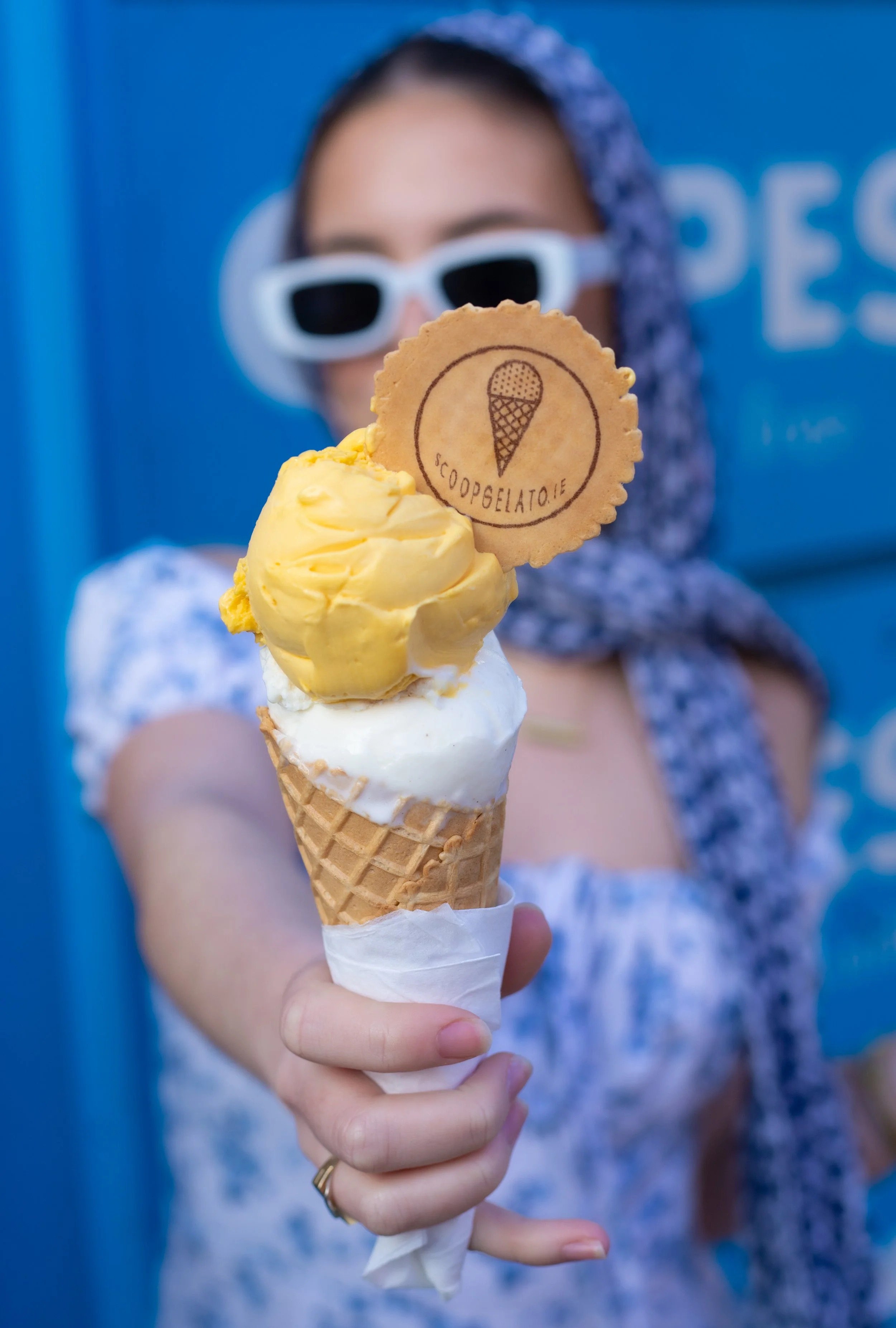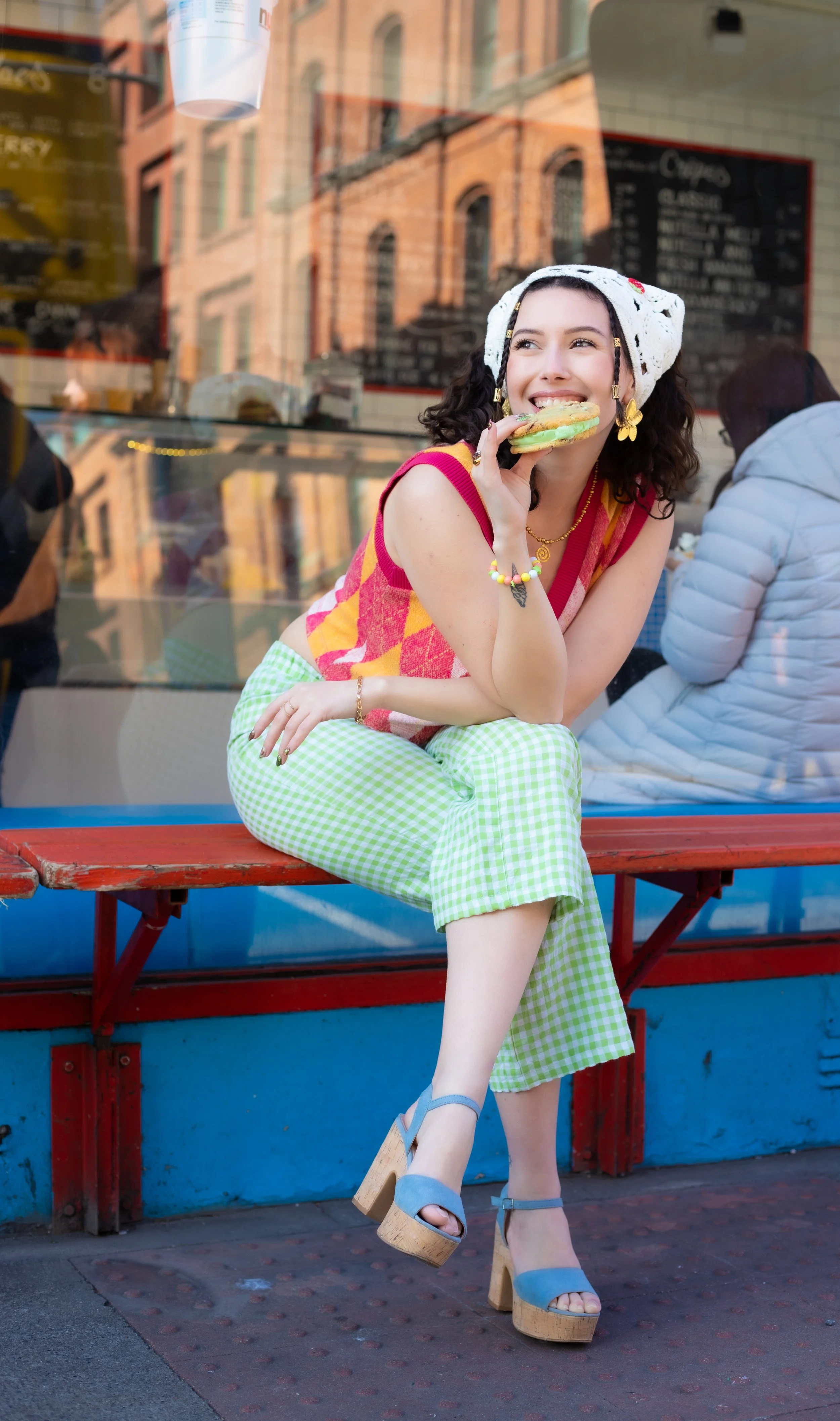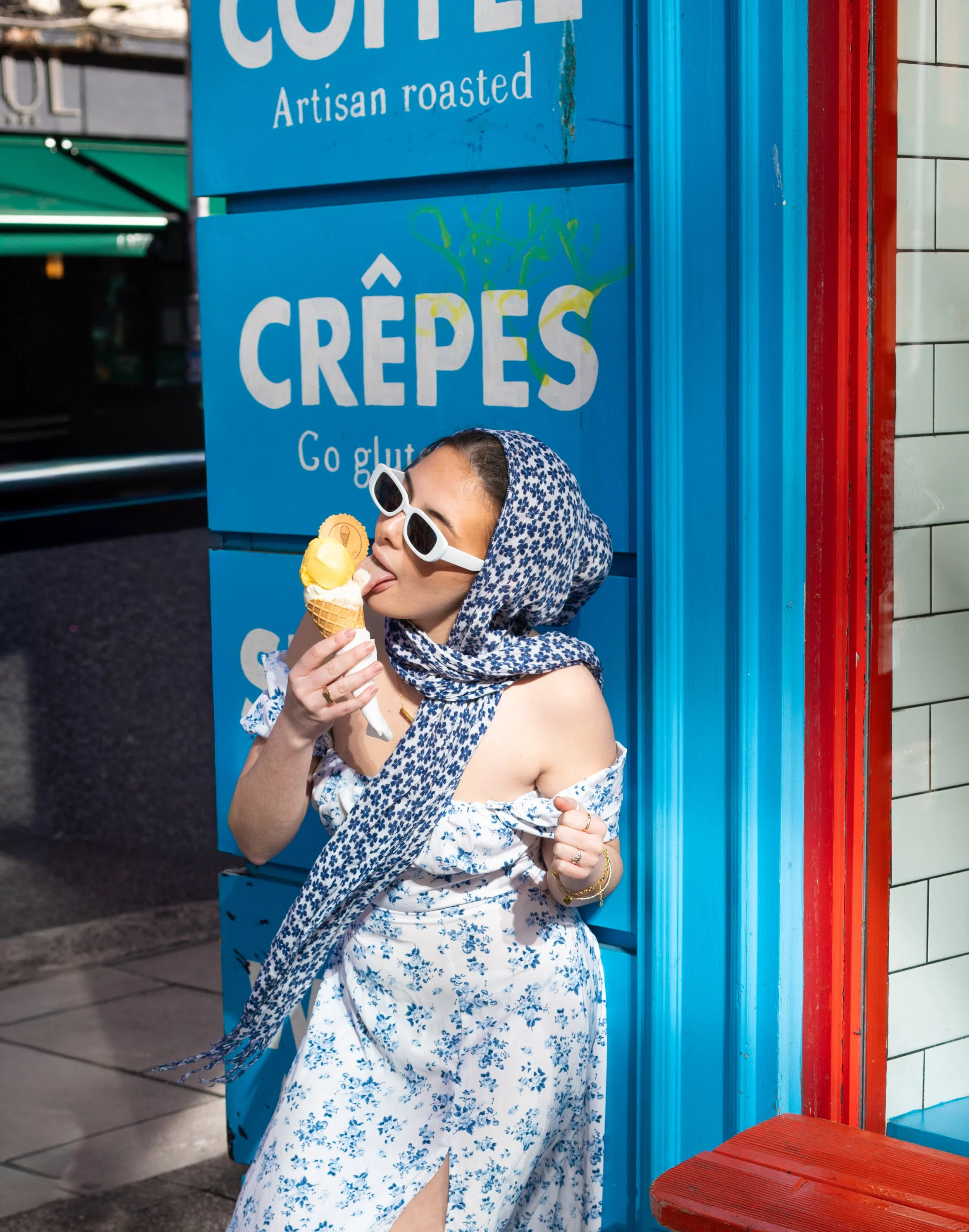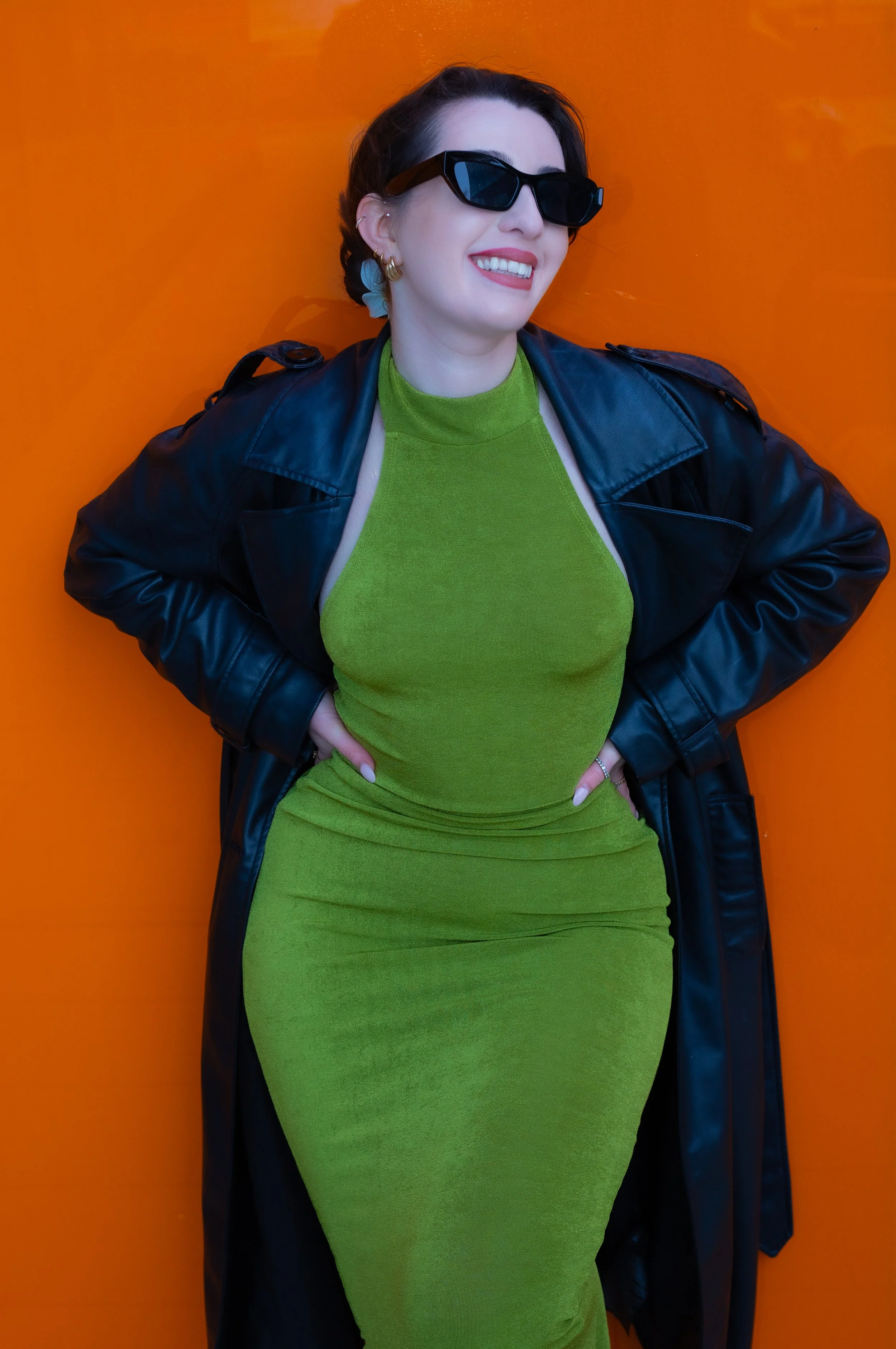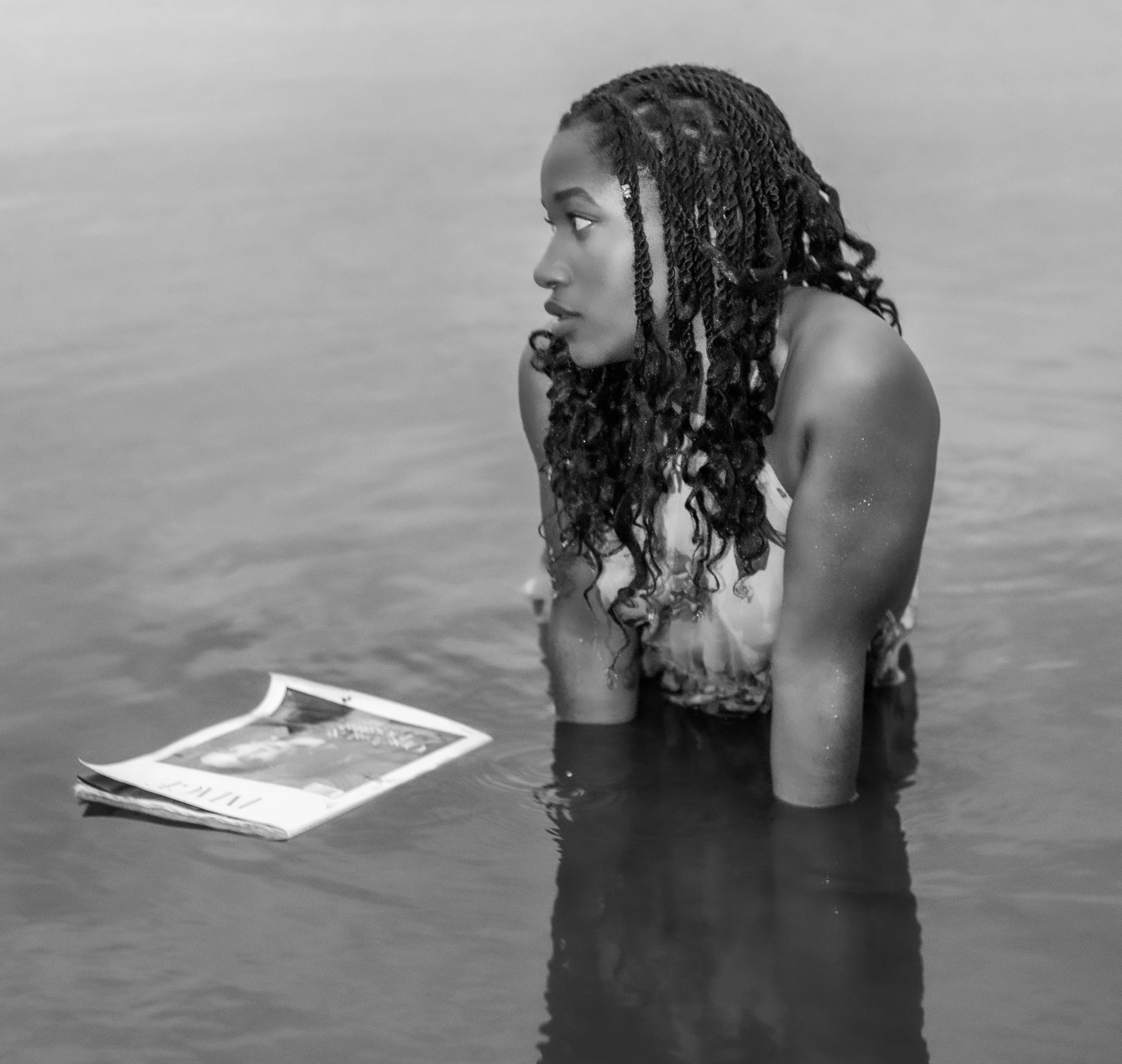 A woman with long black hair wearing yellow lingerie sitting outdoors during sunset, surrounded by greenery and flowers.