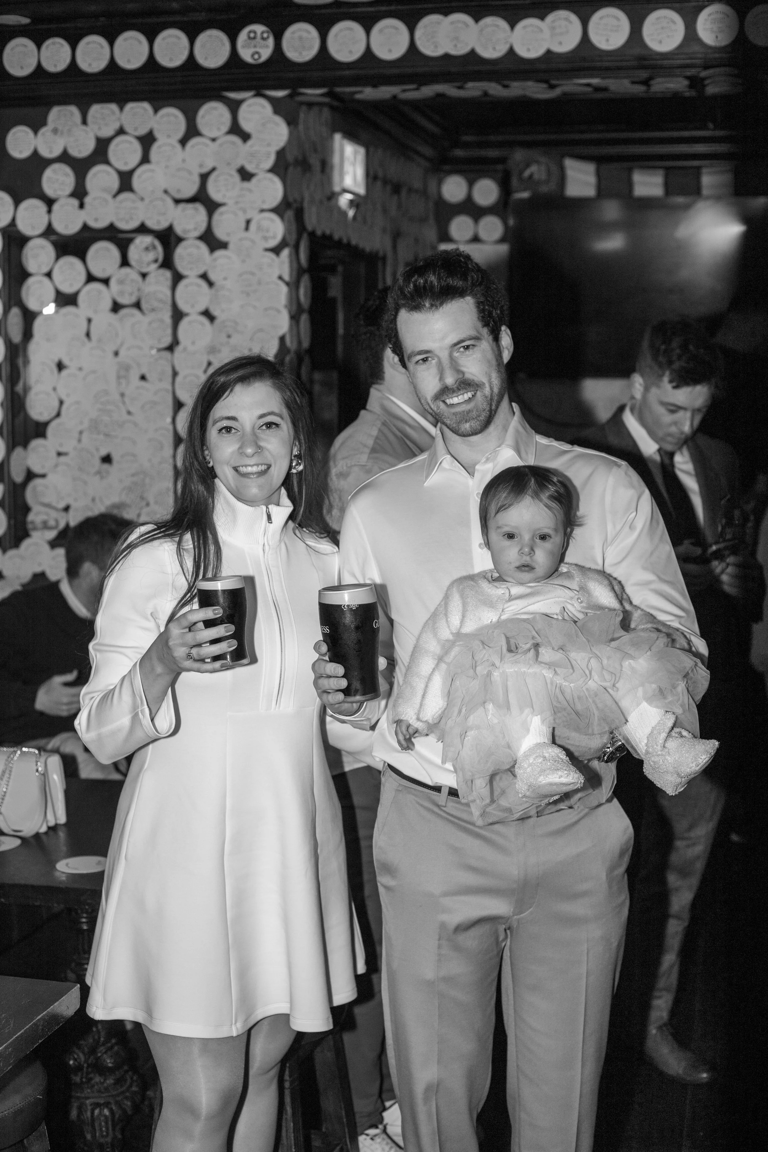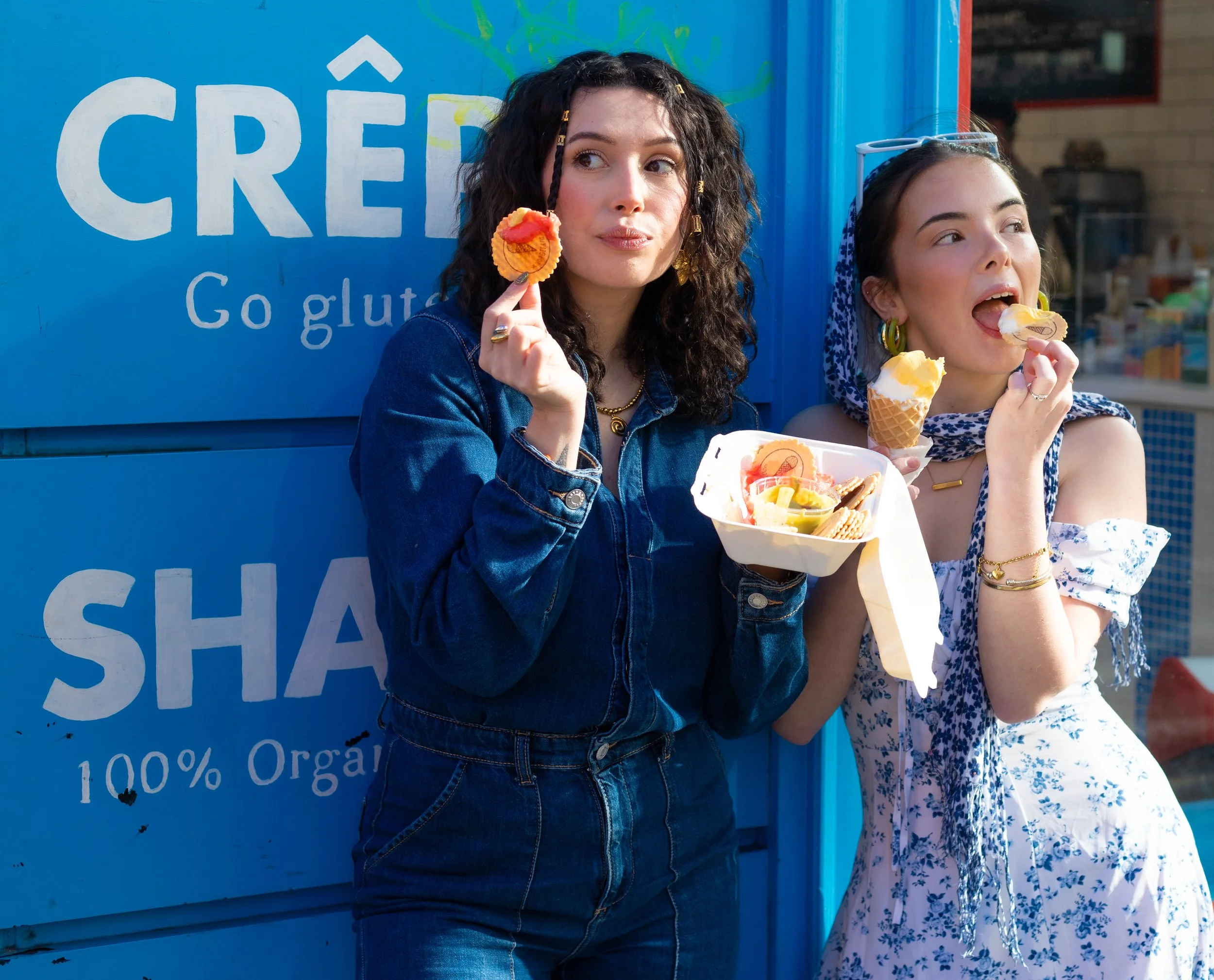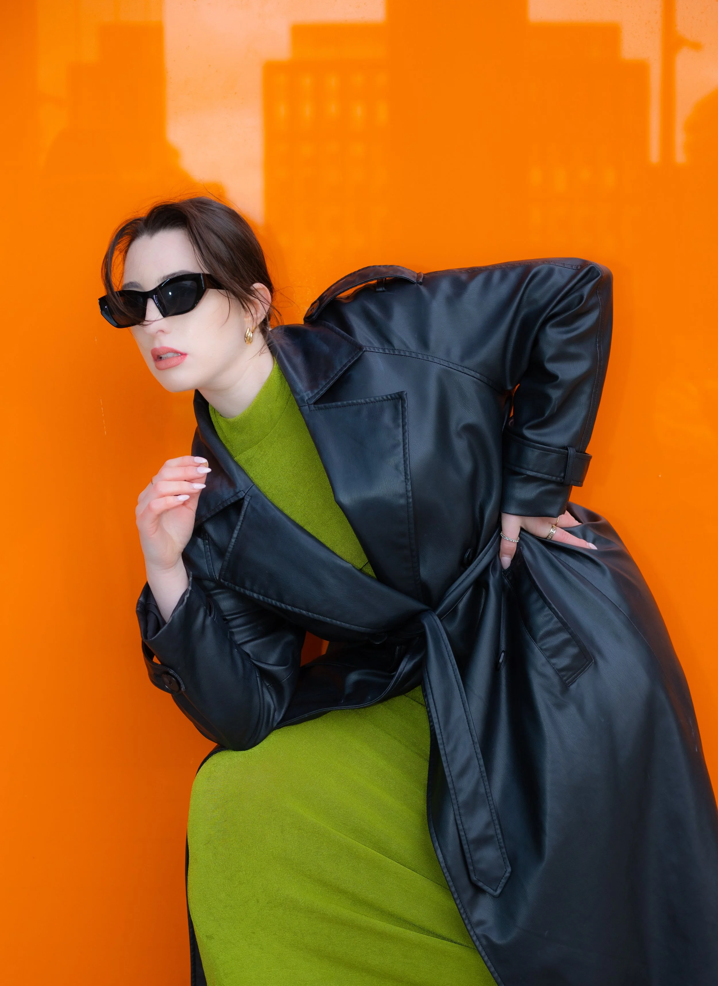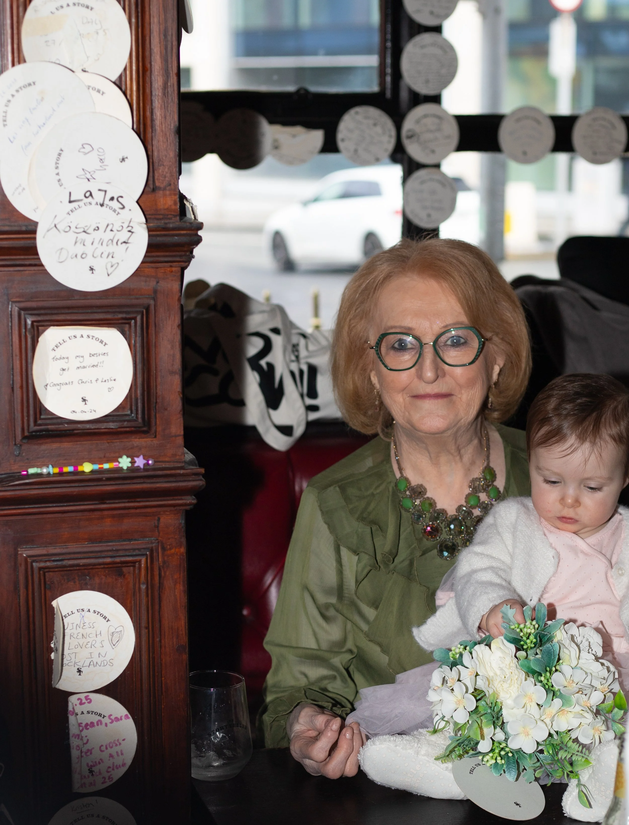 Two women wearing black lace lingerie, stockings, and high heels standing near a window, holding hands and embracing.
