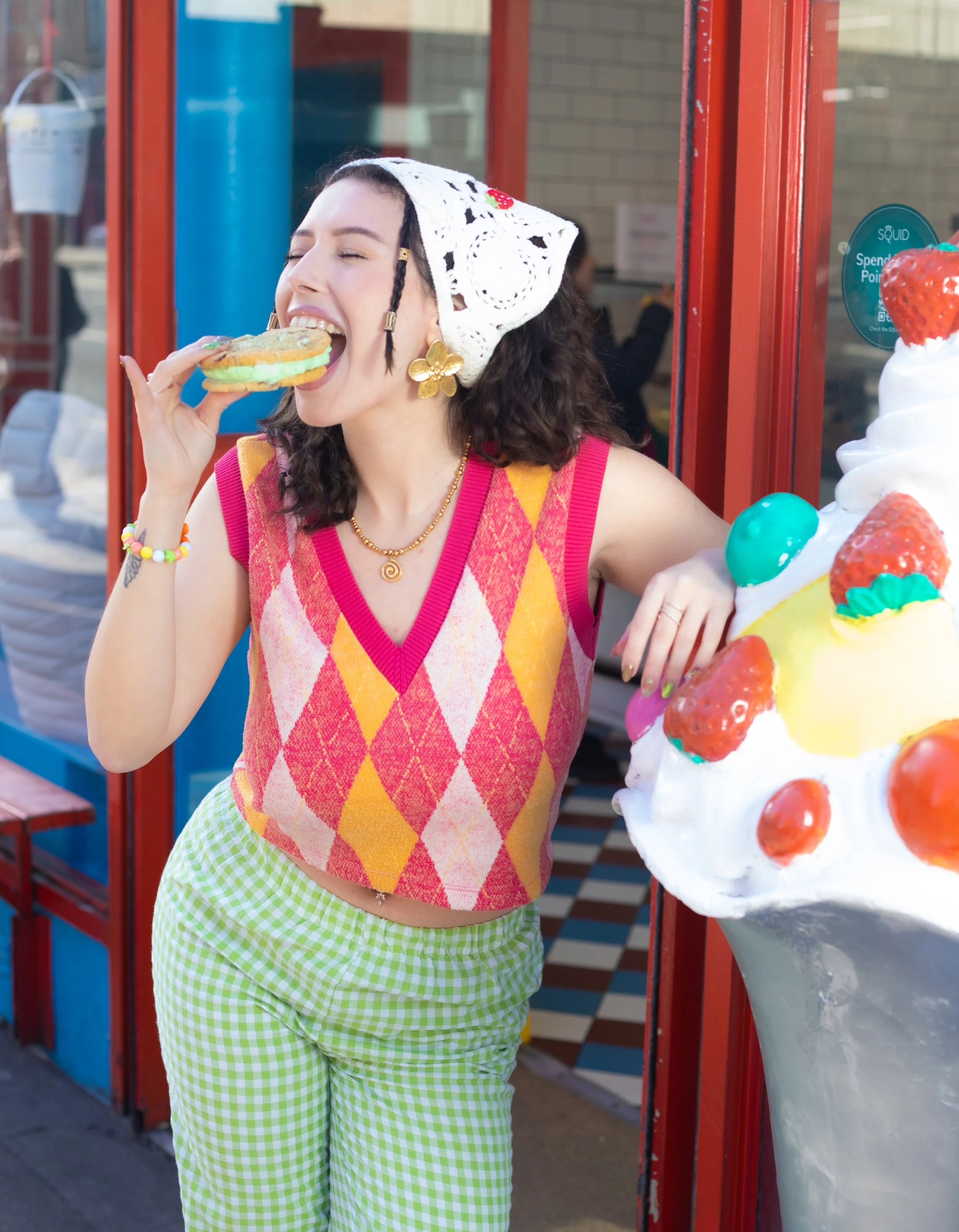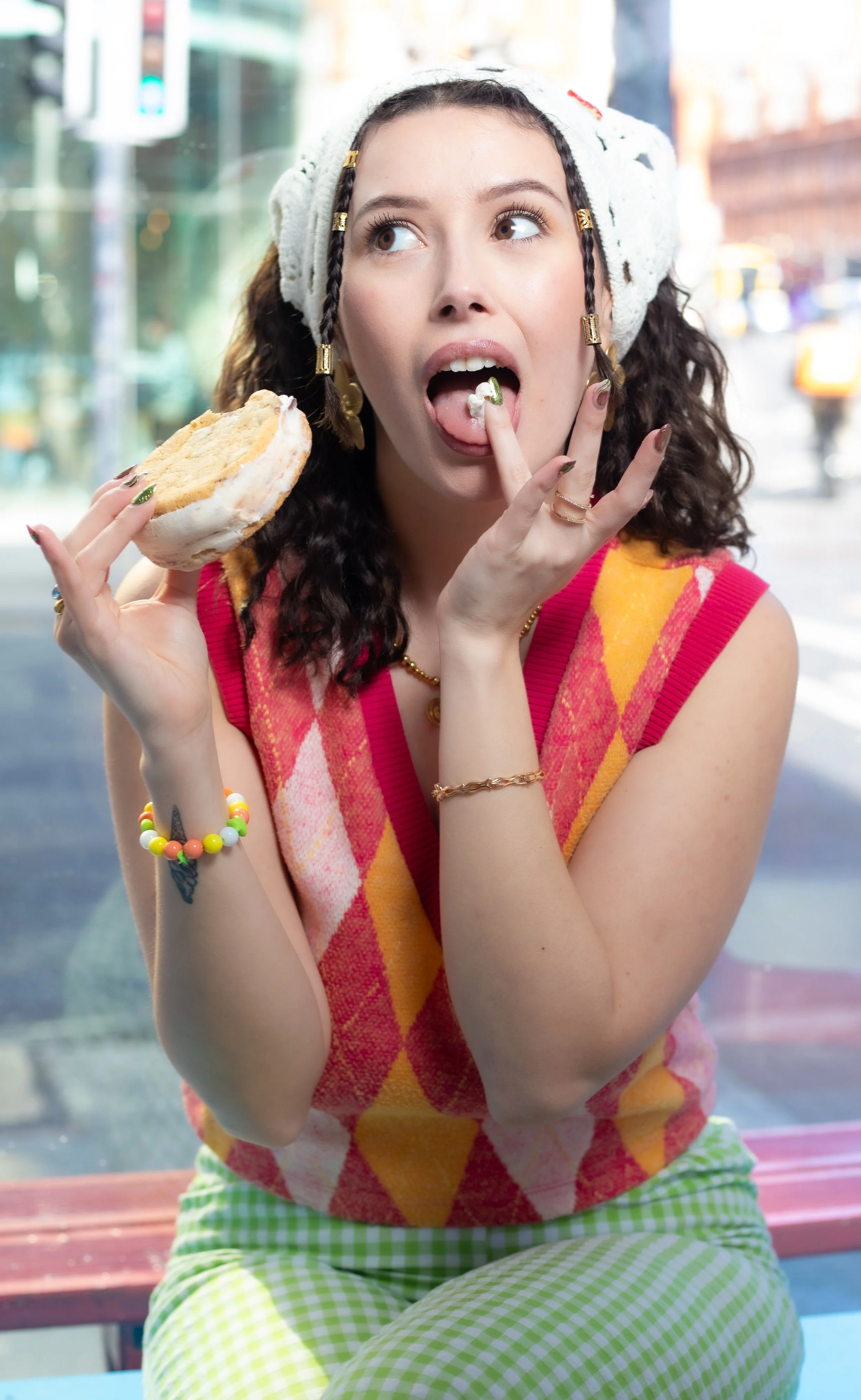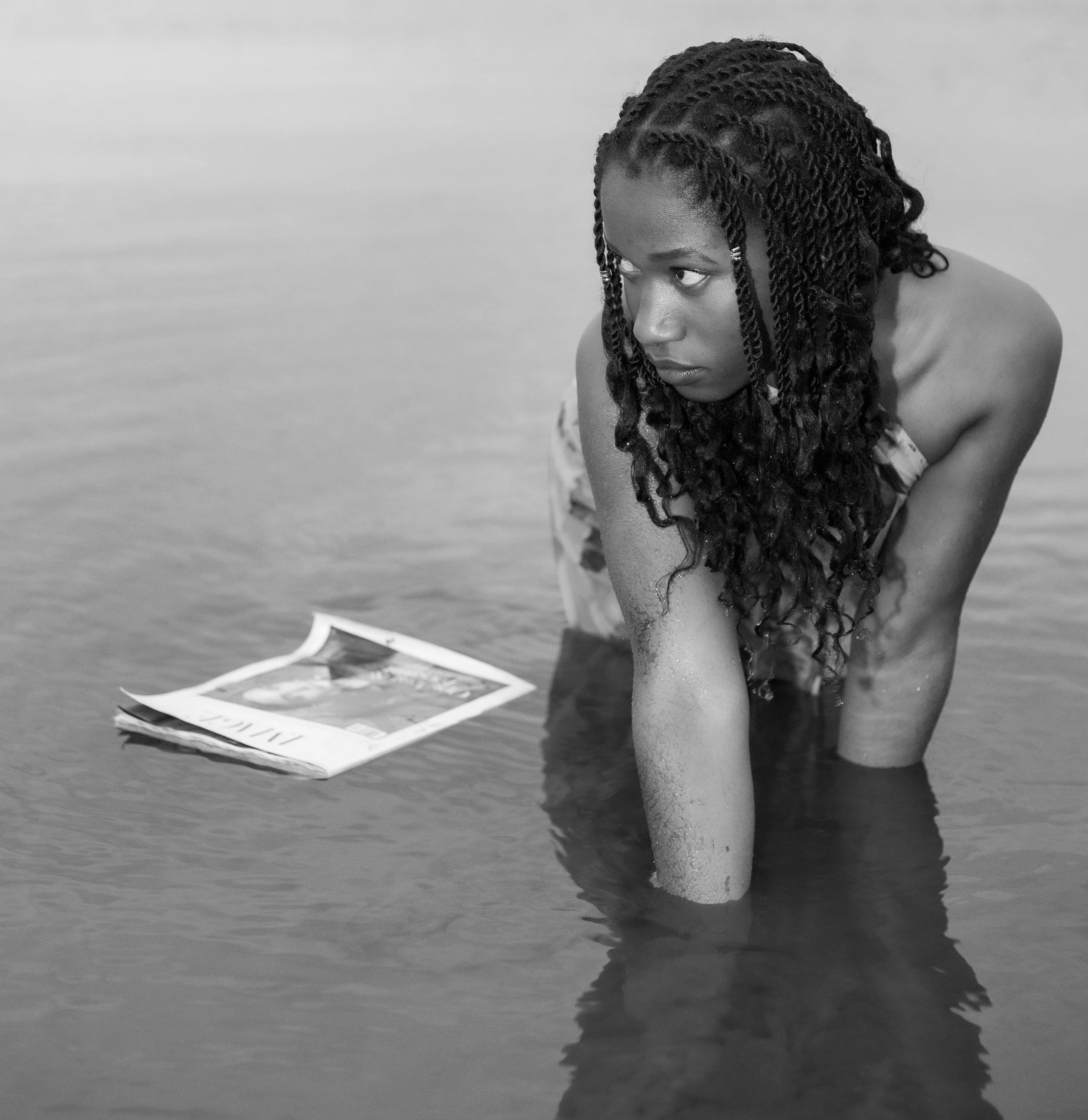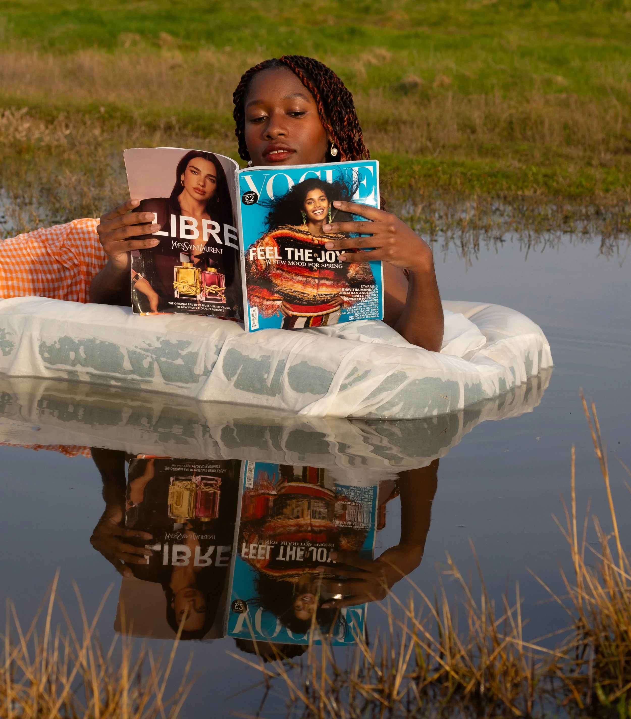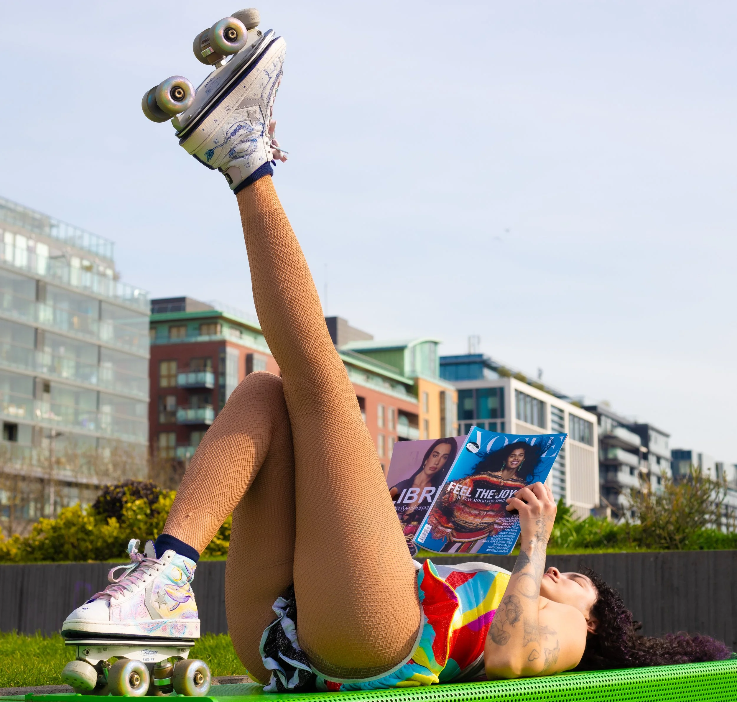 A woman lying upside down on a bed with her legs raised in the air, reading a newspaper. She is wearing thigh-high stockings and the room appears to be a bedroom with a bed, pillows, and a plant in the background.